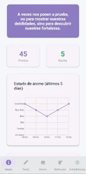 Salud mental bienestar total is een gratis Android-app die zich richt op het verbeteren van emotioneel welzijn. Gebruikers ontvangen dagelijkse doelen en gepersonaliseerde aanbevelingen om hun mentale gezondheid te bevorderen. De app biedt ook inspirerende verhalen, motiverende berichten en meer dan 20 psychologische tests die inzicht geven in de persoonlijkheid en psychologische toestand van de gebruiker. Deze tests behandelen onderwerpen zoals depressie, angst, en zelfs relatiecompatibiliteit.